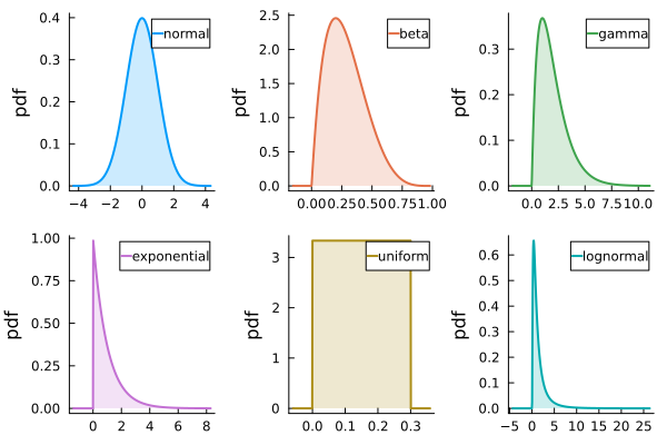 to_physical_space!(x, samples)Examples of some distributions available from Distributions.jl are shown below.