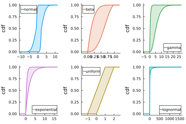 x = RandomVariable(pbox, :x)RandomVariable{ProbabilityBox{Normal}}(ProbabilityBox{Normal}(Dict{Symbol, Union{Real, Interval}}(:μ => [-1, 1], :σ => 1), 0, Inf), :x)Examples of some parametric p-boxes are shown below.